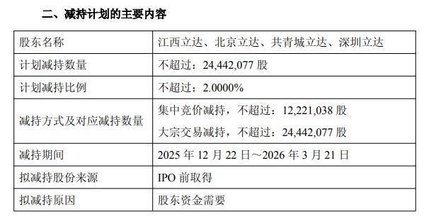 江西立达、北京立达、共青城立达、深圳立达计划通过大宗交易方式和/或集中竞价方式减持其持有的公司股份,拟减持股份数量合计不超过24,442,077股,拟减持股份合计占公司总股本的比例不超过2.0000%。本次减持期间:通过集中竞价方式减持的,自公告披露之日起3个交易日后的3个月内进行,且在任意连续90个自然日内减持股份的总数不超过公司股份总数的1.0000%暨12,221,038股;通过大宗交易方式减持的,自公告披露之日起3个交易日后的3个月内进行,且在任意连续90个自然日内减持股份的总数不超过公司股份总数的2.0000%暨24,442,077股。本次减持,上述主体计划减持公司股份合计不超过公司股份总数的2.0000%暨24,442,077股。