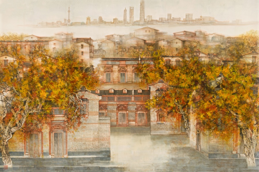 汪家芳深受海派文化海纳百川、兼容并蓄特质的熏陶。他的创作不仅扎根于传统水墨语言,更在坚守笔墨意蕴与写意精神的同时,积极探索其当代转化,将传统的山水精神与城市精神相融合,形成“雄浑中见精微、磅礴中蕴温情”的独特艺术面貌。他在“城市山水”创作上独树一帜:既保留水墨氤氲的东方气韵,又巧妙融入西方构成与光影语言;以兼工带写的笔法,将石库门、苏州河、外滩霓虹与市井烟火凝练为苍润深沉的墨象,在厚重中透出灵秀,于宏大处见温情。他的作品不仅构建出融自然山川、城市景观与历史文脉于一体的意境空间,更体现出强烈的在地关怀与时代感知。
