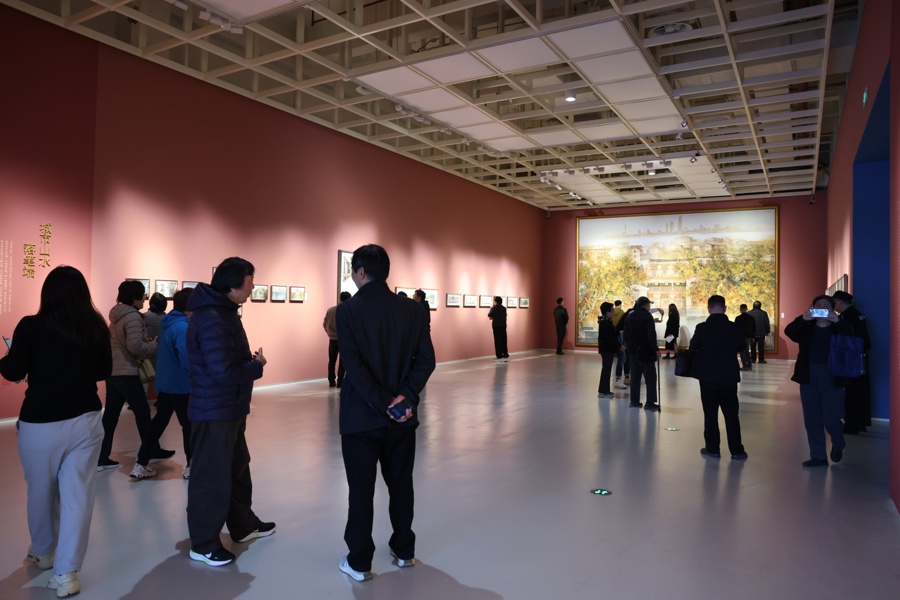 步入展厅,《五岳归来》以遒劲皴擦与淋漓水墨勾勒名山巍峨,展现画家对中华山川的崇高礼赞;《闵行十二景》则聚焦浦江两岸的人文景观,以细腻笔触绘写街巷烟火、滨江新貌,传递出对故土深沉的眷恋与讴歌;首次展出、取材于长沙湘江西岸岳麓书院的《高山仰止》,以苍润笔墨再现书院古雅气韵,堂前“实事求是”匾额之意蕴融于笔墨间,既彰显中华文脉之厚重,亦藏笃行致远之胸襟。