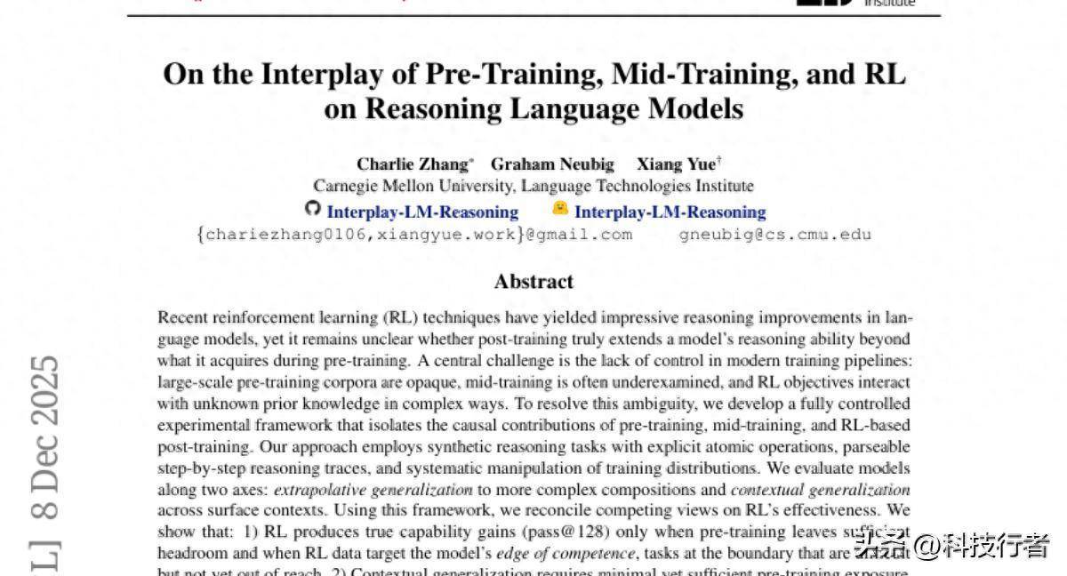 当我们教孩子学数学时,通常会经历这样的过程:先让他们掌握基本的加减法,然后练习更复杂的运算,最后通过大量习题来巩固和提升技能。有趣的是,训练人工智能也遵循着类似的规律。来自卡内基梅隆大学语言技术研究所的Charlie Zhang、Graham Neubig和Xiang Yue在2025年12月发表的一项研究中,首次系统性地揭示了AI训练过程中"预训练、中期训练和强化学习"三个阶段如何协同工作,让AI的推理能力实现质的飞跃。这项题为"On the Interplay of Pre-Training, Mid-Training, and RL on Reasoning Language Models"的研究,为我们理解AI如何变得更聪明提供了全新的视角。